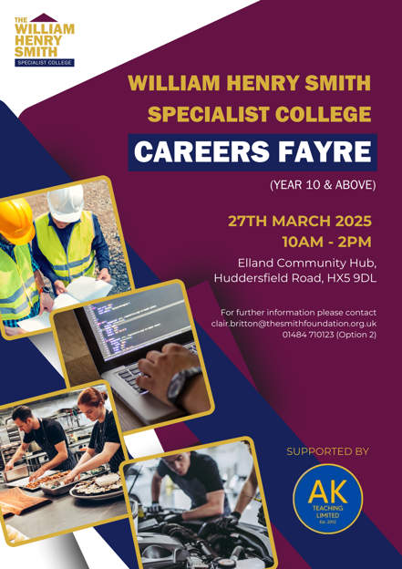 Students from Year 10 onwards are invited to attend the Careers Fayre hosted by the the William Henry Smith Specialist College at the Elland Community Hub on the 27th March 2025 from 10am - 2pm.